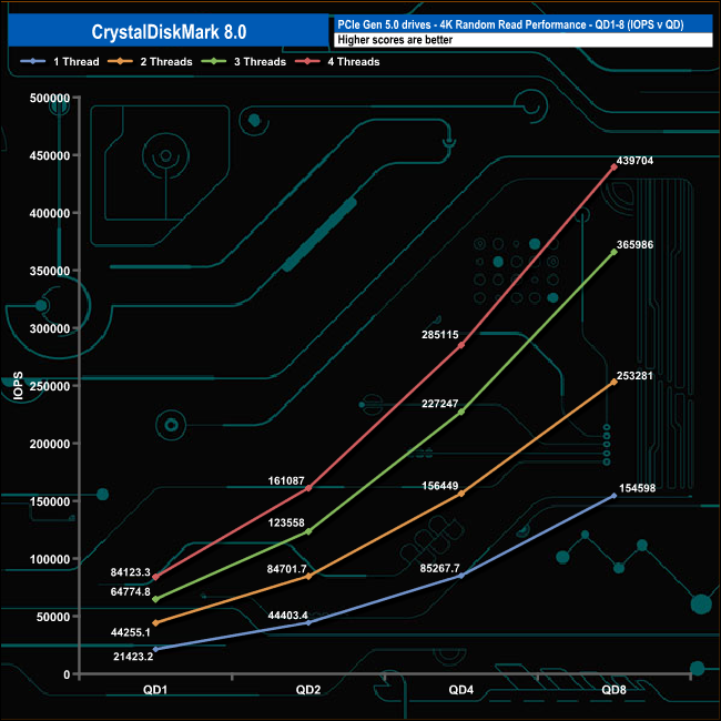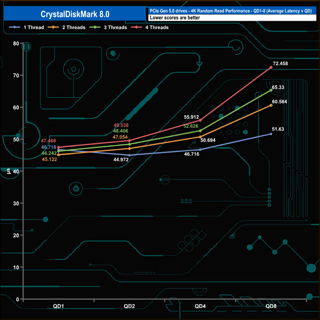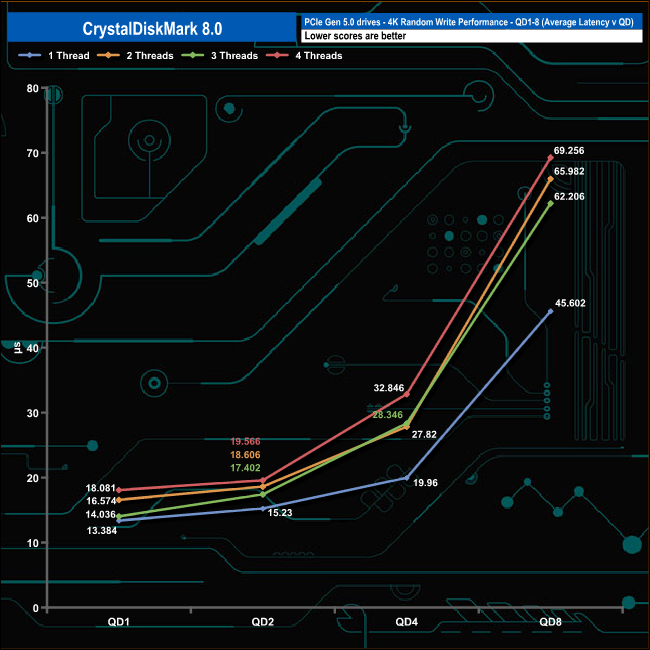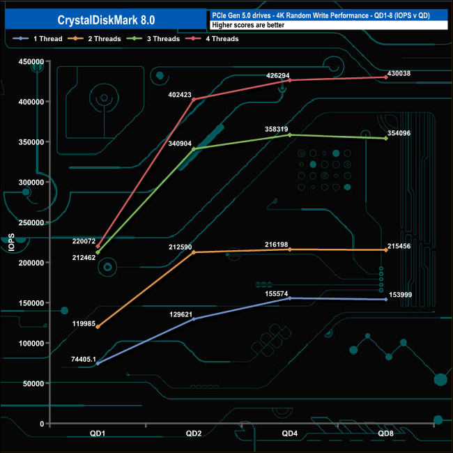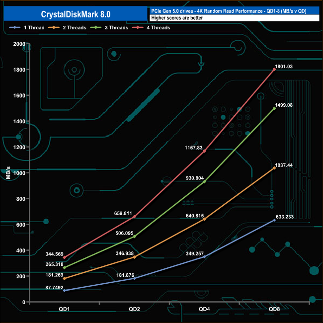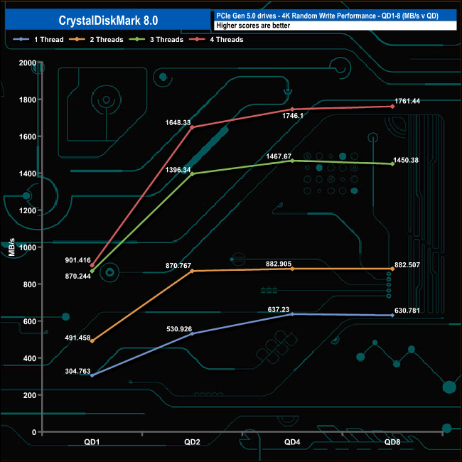 We used CrystalDiskMark 8 to test the random performance of the drive at lower queue depths (QD1 – QD8, where most of the everyday workloads occur) using 1 to 4 threads.