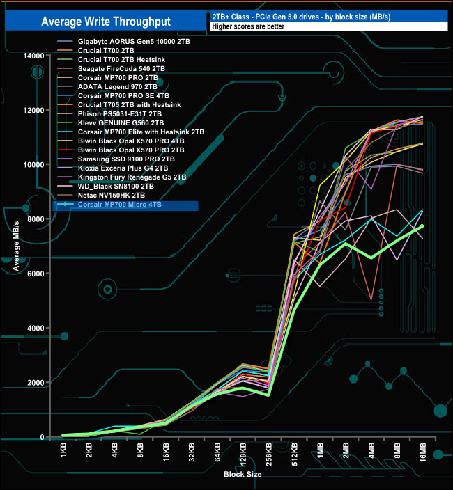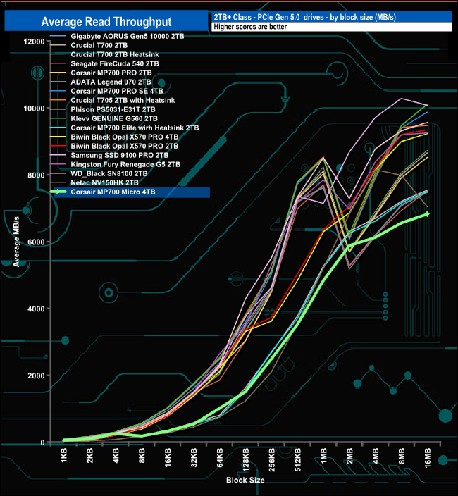 In our read-throughput test, the 4TB MP700 Micro peaked at 6,820.59MB/s at the 16MB block mark, some way off the official maximum of 9,400MB/s.
