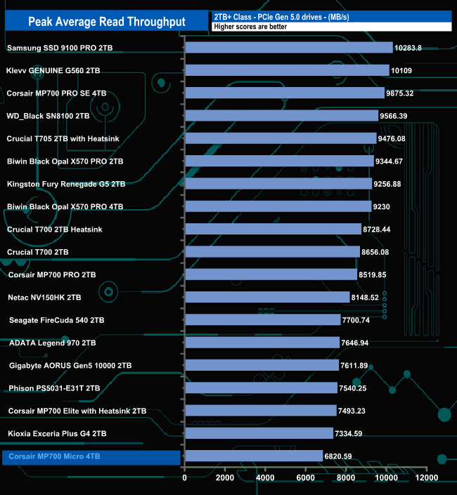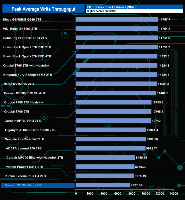 With a test result of 7,727.68MB/s, the 4TB Corsair MP700 Micro sits at the bottom of the table.