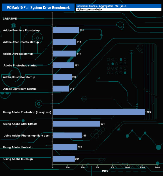 Using PCMark10's Full System Drive Benchmark, the six Adobe startup traces produced an average of 239MB/s, with the fastest being the Adobe Premiere Pro startup trace at 351MB/s, with the Lightroom trace the slowest at 218MB/s. For the five usage traces, the fastest was, as usual, the Photoshop heavy usage trace at 1,229MB/s, and including this result, the drive averaged 572.4MB/s for the five traces.