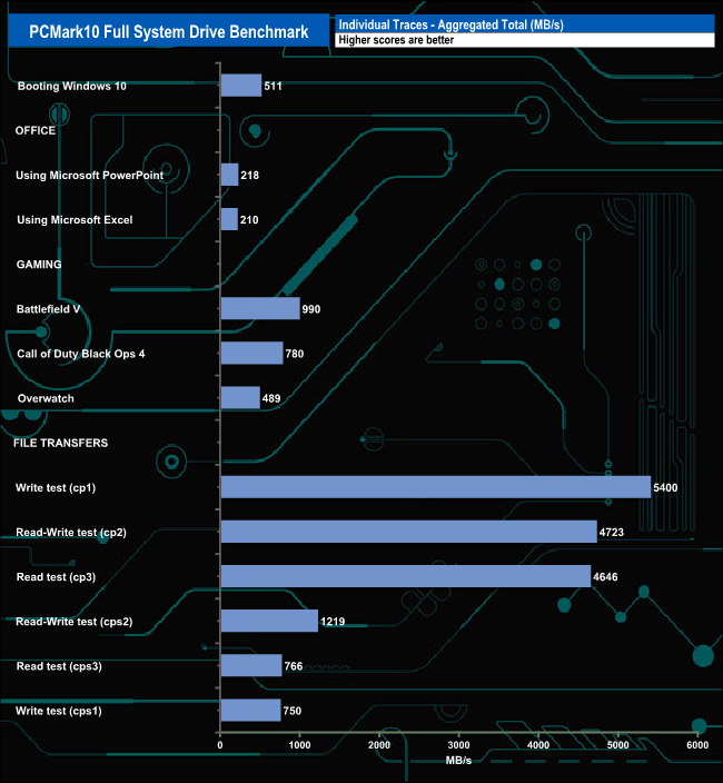 The three gaming traces produced an average result of 753MB/s, the fastest being Battlefield V at 990MB/s. Next came Call Of Duty Black Ops 4 at 780MB/s, followed by Overwatch at 489MB/s. When it came to the six file transfers, the drive averaged 2,9177MB/s with the fastest being the cp1 Write test at 5,400MB/s.