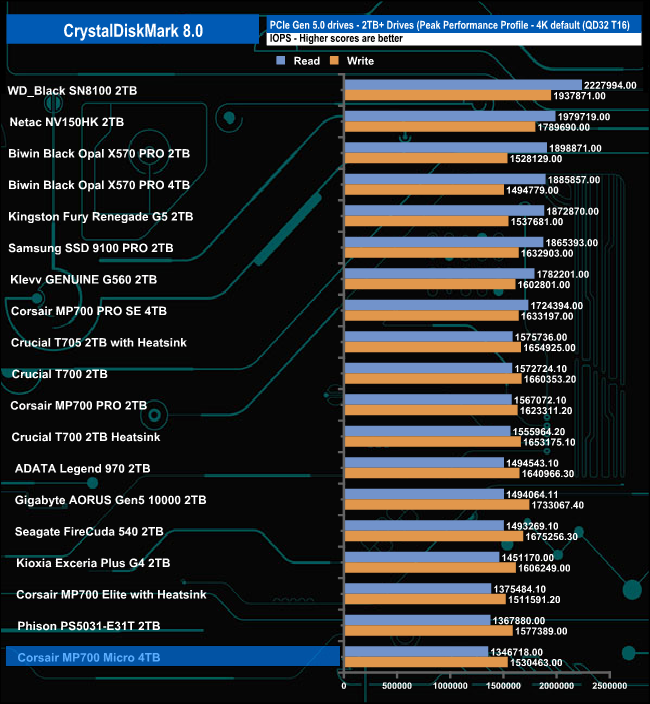 We can confirm the official random 4K figures for the drive of up to 1,300,000 IOPS for reads and up to 1,400,000 IOPS for writes, and even better than that, using the Peak Performance profile of CrystalDiskMark 8 with default test results of 1,346,718 IOPS for reads and 1,530,463 IOPS for writes. Looking at the result screens, it appears that the drive doesn't have a preference for what type of data it is being asked to handle.