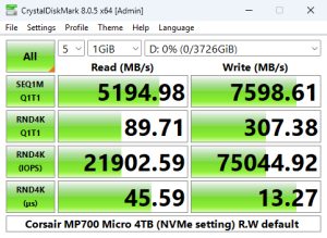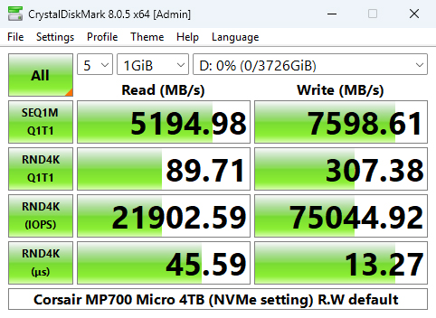 The Corsair MP700 Micro sits in last place in the CrystalDiskMark 8 Real World result table with a read score of 5,194MB/s, but its write result of 7,598MB/s is much stronger.
