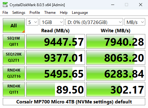 As you can see from the benchmarking screens, we could confirm the official maximum Sequential read figure of 9,400MB/s with a test result of 9,447MB/s from the default test. The write result of 7,940MB/s is a little shy of the official maximum of 8,100MB/s.