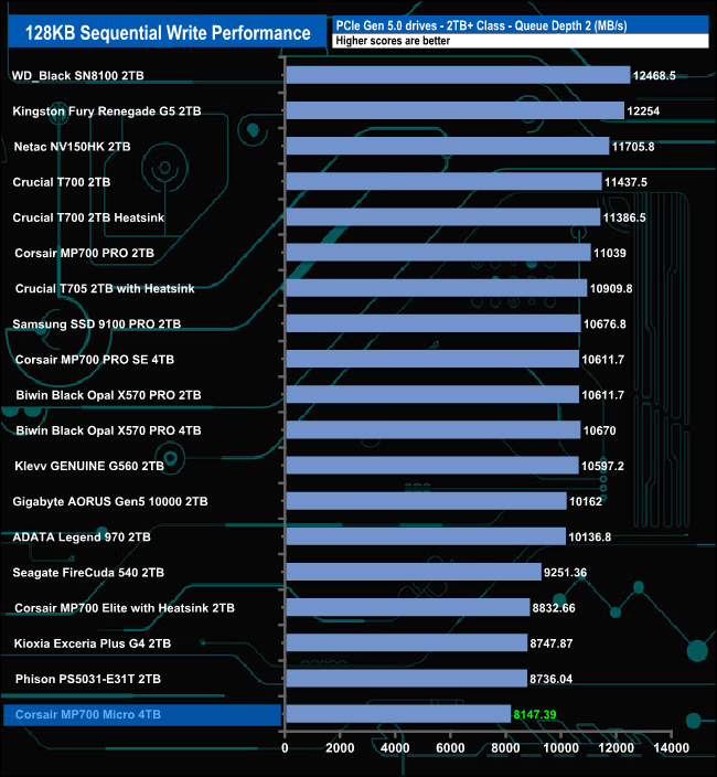 When it comes to Sequential write performance, the drive props up the table at every tested queue depth. It's closest to the next drive in the table at QD2.