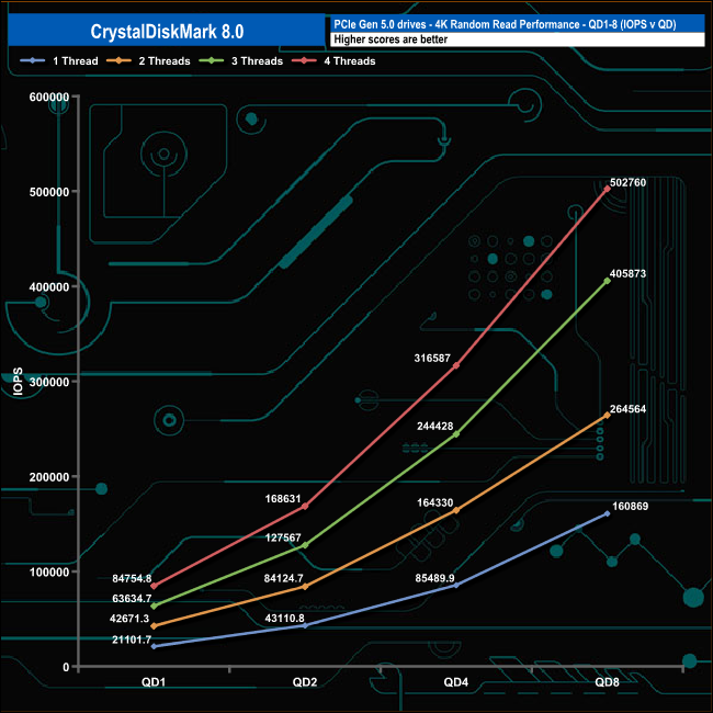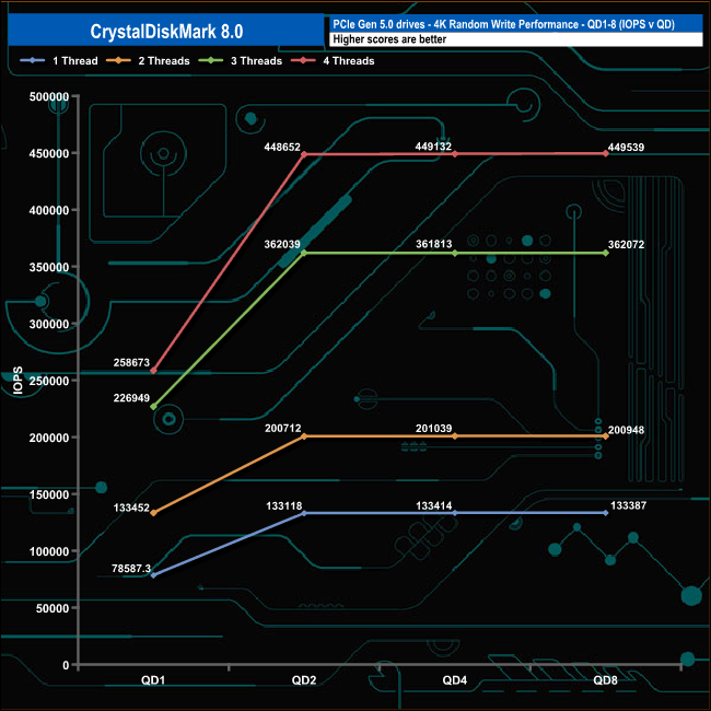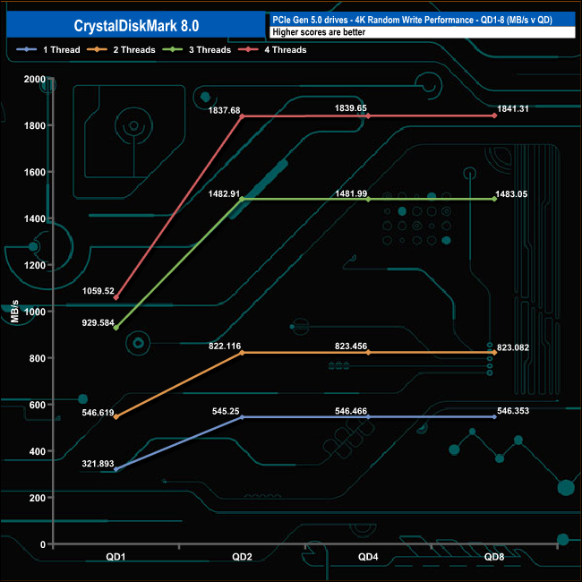 We used CrystalDiskMark 8 to test the random performance of the drive at lower queue depths (QD1 – QD8 where most of the everyday workloads occur) using 1 to 4 threads.