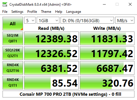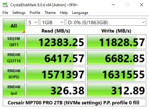As you can see from the benchmark result screens we can confirm the official Sequential read/write figures for the 2TB MP700 PRO of 12,400MB/s and 11,800MB/s respectively, with a best test read result of 12,397MB/s with writes at 11,821MB/s.