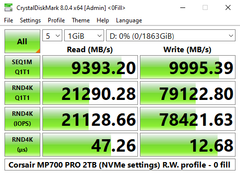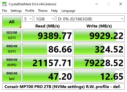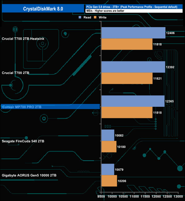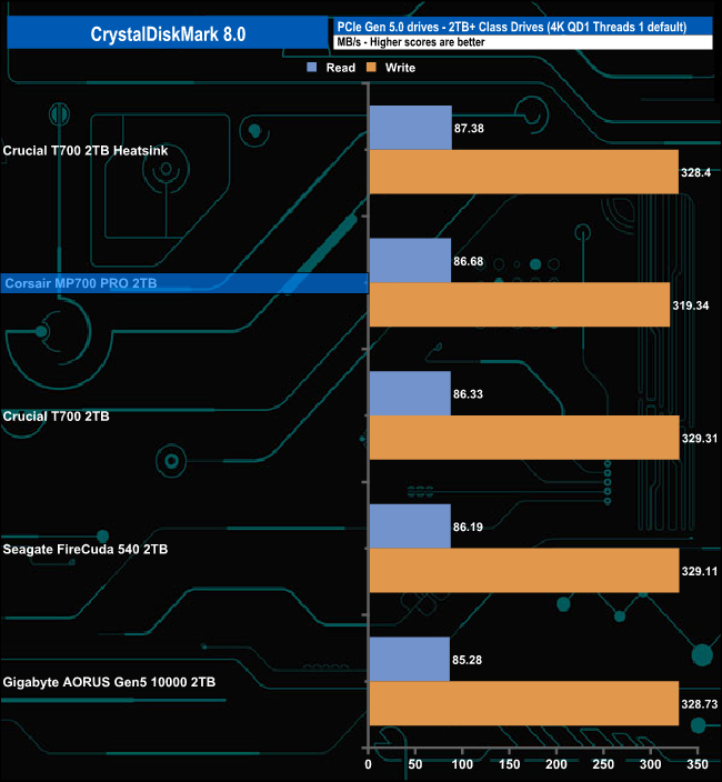 In CrystalDiskMark 8's 4K QD1 T1 test, the Corsair MP700 PRO splits the two versions of Crucial's T700 drive. It has a slightly faster read speed than the plain T700 but has a little slower write speed than both the Crucial drives.