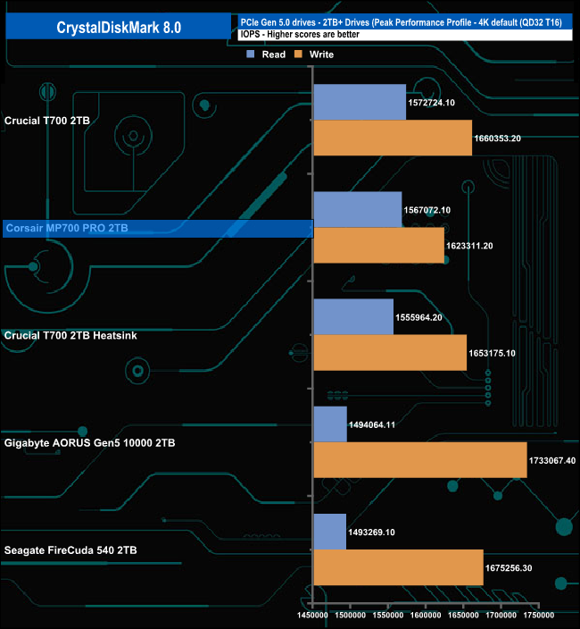 Using the Peak Performance profile of the CrystalDiskMark benchmark we could confirm the official 4K random read/write figures for the drive of up to 1,500,000 IOPS for reads and up to 1,600,000 IOPS for writes and even bettered them a fraction with read/write test results of 1,567,072 IOPS and 1,623,311 IOPS respectively. That read IOPS figure is good enough for the second spot on the chart, but its write performance isn't as good as the two Crucial T700 drives it splits.