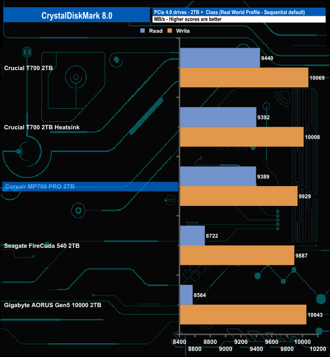 Corsair's MP700 PRO sits in third place in the Real World Profile chart with Sequential read/write scores of 9.389MB/s and 9,929MB/s respectively.