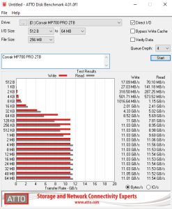 Using the ATTO benchmark, the MP700 PRO write performance peaked at the 256KB mark at 11,003MB/s and plateaued at that point for the rest of the test up to an I/O size of 8MB. The read performance levelled off between the 256KB and 512KB points but then got a second wind, ending up at 11,530MB/s at the 8MB mark.