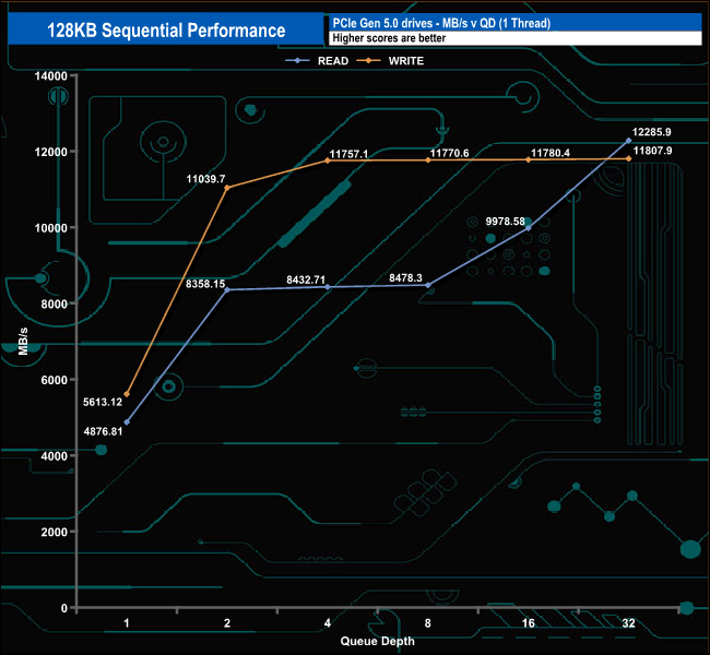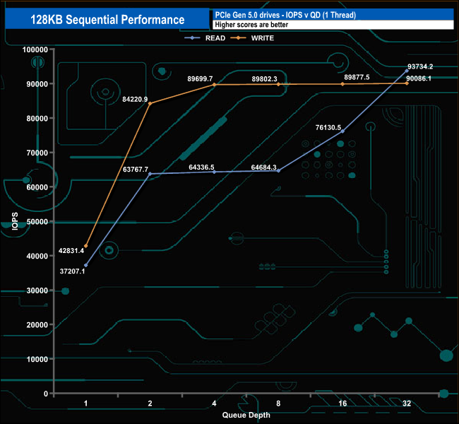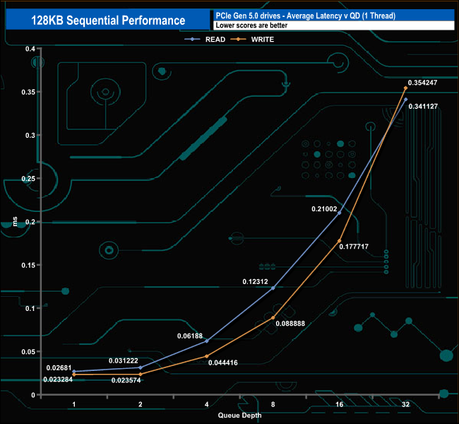 We used CrystalDiskMark 8‘s custom settings to test the Sequential read and write performance of the drive through a range of queue depths. The setup for the tests is listed below.