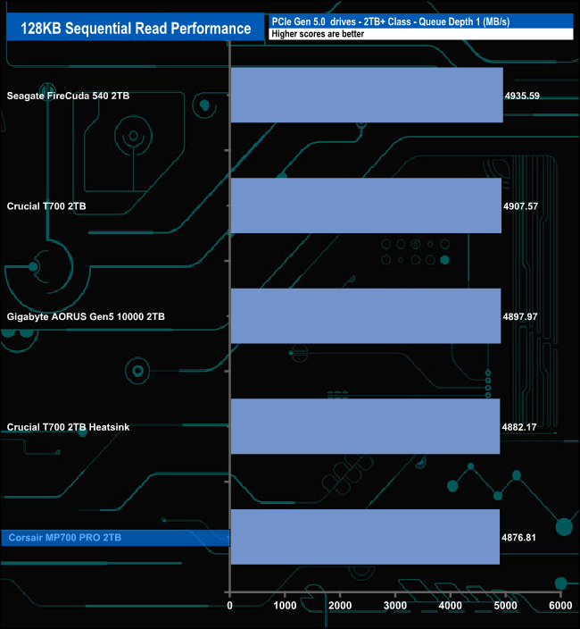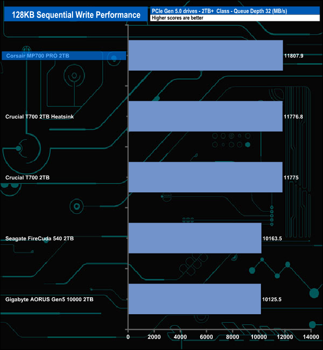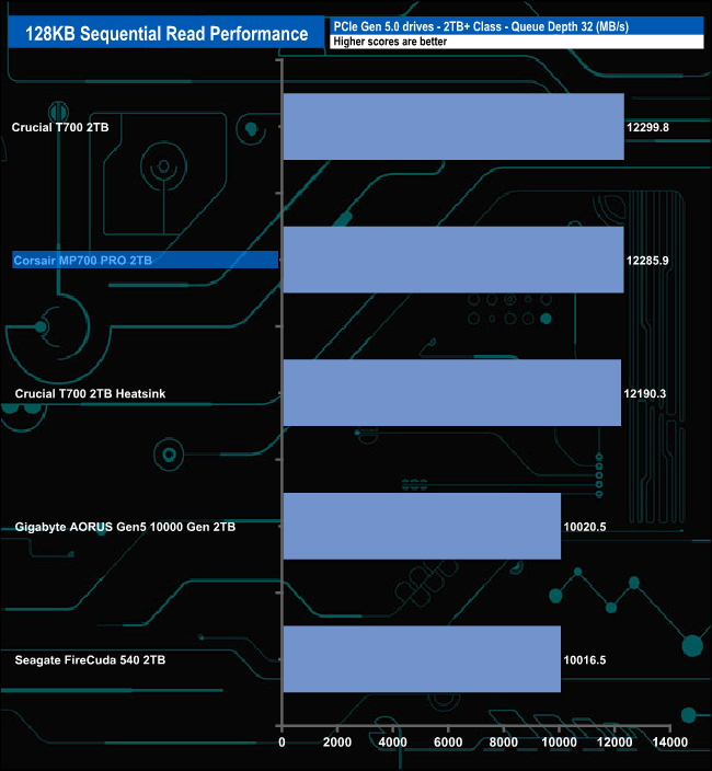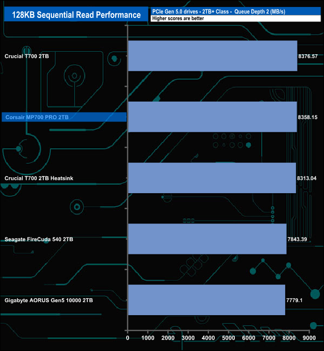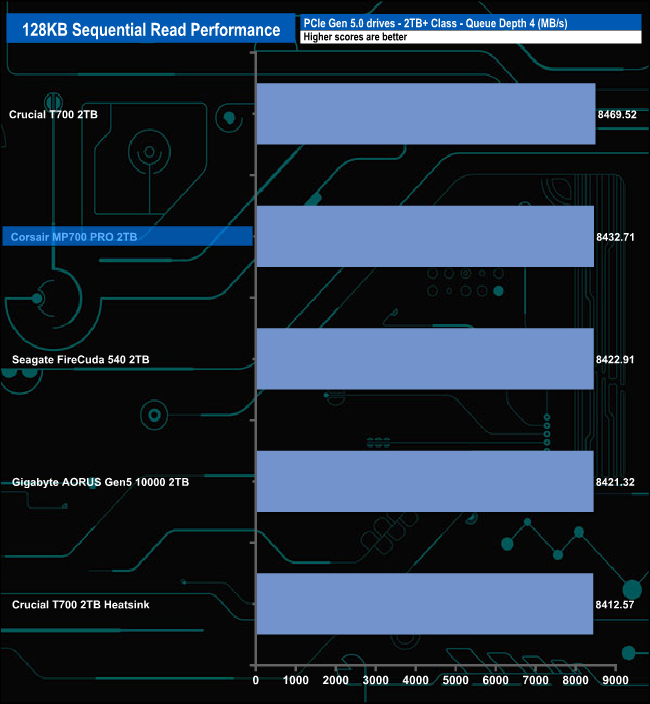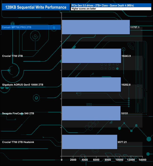 At QD1, the Corsair MP700 PRO sits at the bottom of the table for Sequential reads by a tiny margin. However, by QD2 and beyond it has moved into second place behind the standard version of Crucial's T700 drive.