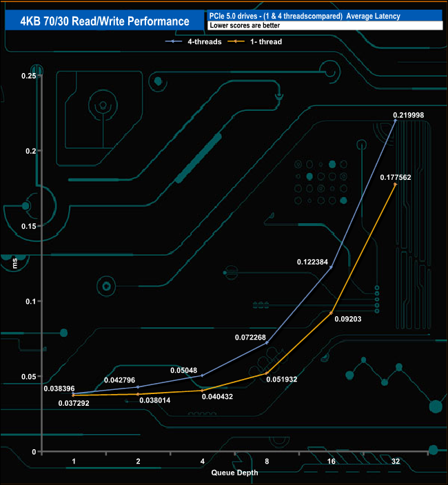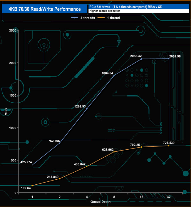 We used CrystalDiskMark 8’s custom settings to test the 4K 70/30 mixed read/write performance of the drive through a range of queue depths using a single thread and four threads.