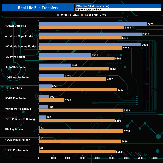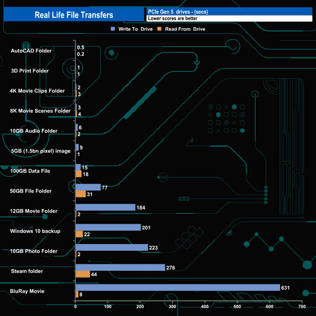 The drive averaged 2,458MB/s when writing the 13 transfer tests with the fastest being the 7,421MB/s for the 100GB Data file transfer and the slowest being the 49MB/s for the 10GB Photo folder. The drive seemed to have problems writing the contents of this, the 12GB Movie and BluRay folders. It wasn't getting anywhere near the temperature threshold while transferring the data so it wasn't throttling causing it to stumble, so it remains a bit of a mystery.