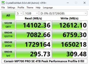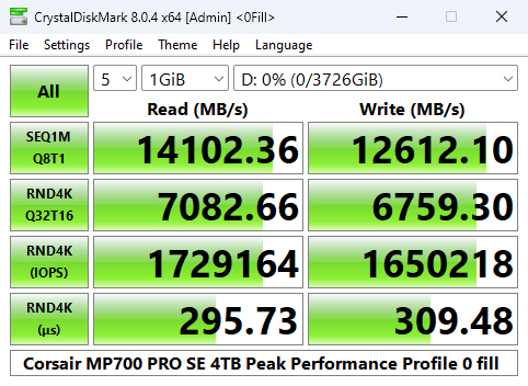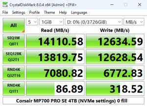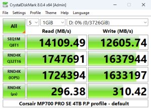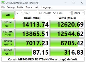 As you can see from the benchmark result screens we can confirm the official Sequential read/write figures for the 4TB MP700 PRO SE of 14,000MB/s and 12,000MB/s respectively, with a best test read result of 14,113MB/s with writes at 12,620MB/s.