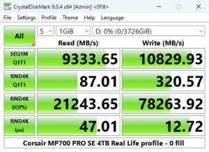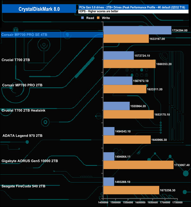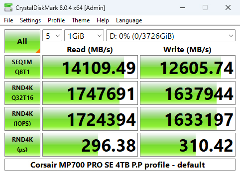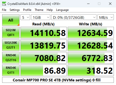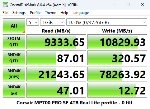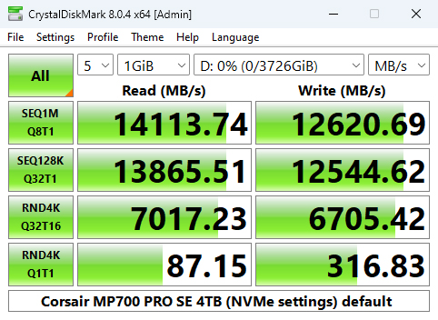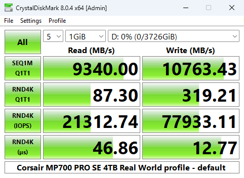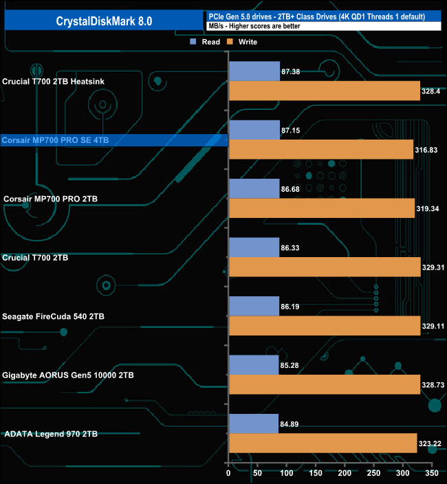 In CrystalDiskMark 8's 4K QD1 T1 test, the Corsair MP700 PRO SE sits just under Crucial's T700. It has a slightly better read score than the standard MP700 PRO but is ever so slightly slower when it comes to write performance.