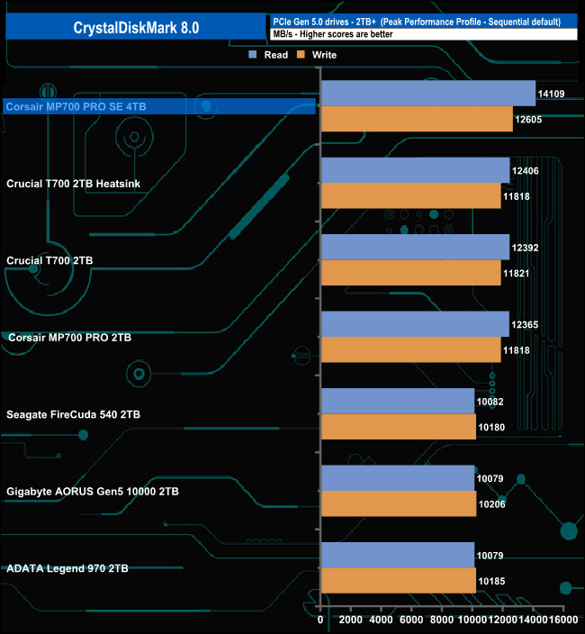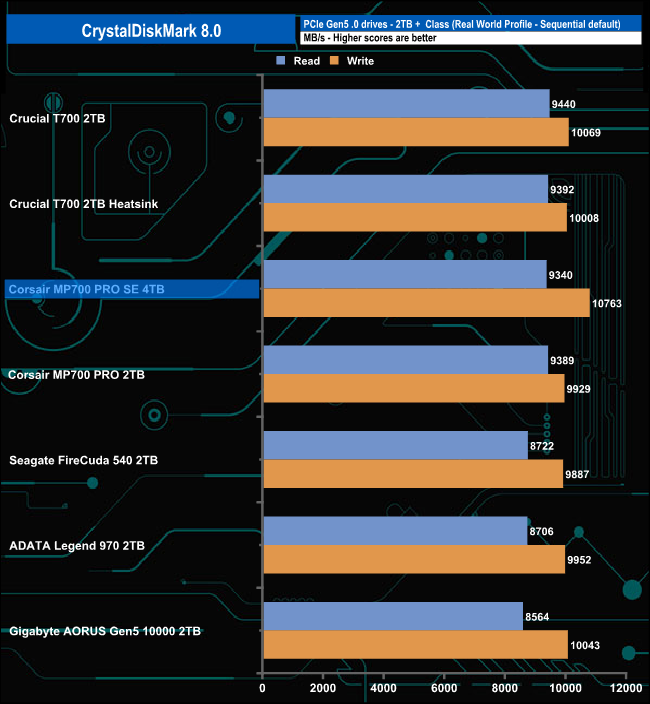 Corsair's MP700 PRO SE sits in third place in the Real World Profile chart with Sequential read/write scores of 9,340MB/s and 10,763MB/s respectively. That write score is the fastest we've seen to date for a Gen 5 drive in this test.