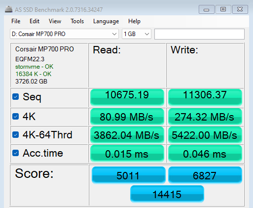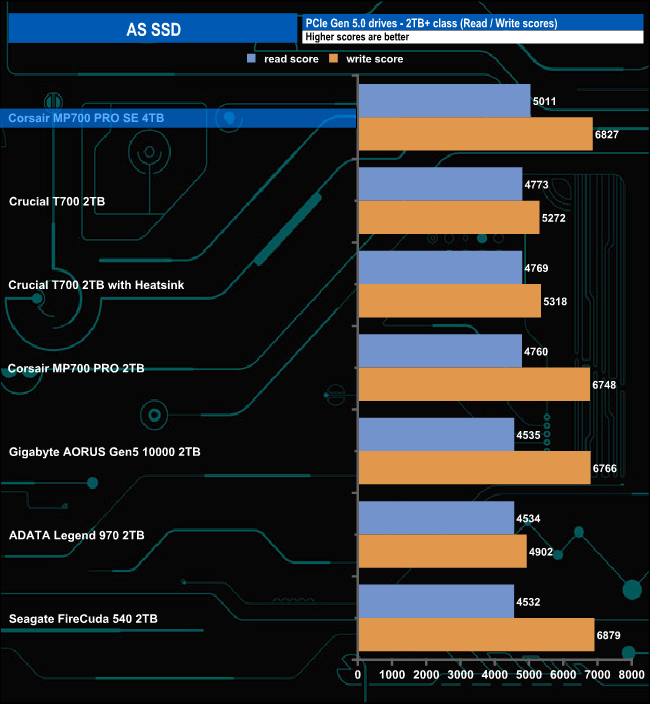 The AS SSD benchmark read score of 5011 sees the 4TB Corsair MP700 PRO SE sitting in first place with the second-best write score of 6827 we've seen to date for a consumer Gen 5 drive.