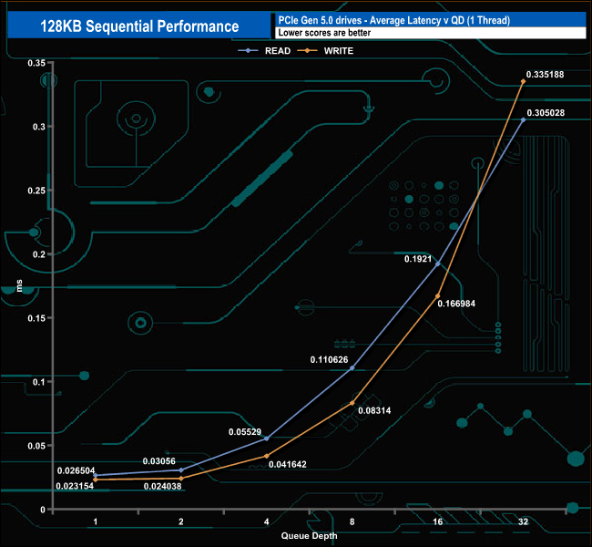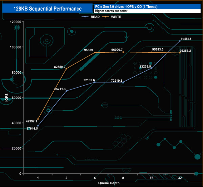 We used CrystalDiskMark 8‘s custom settings to test the Sequential read and write performance of the drive through a range of queue depths. The setup for the tests is listed below.
