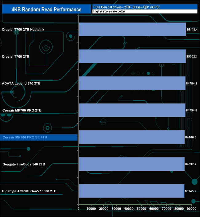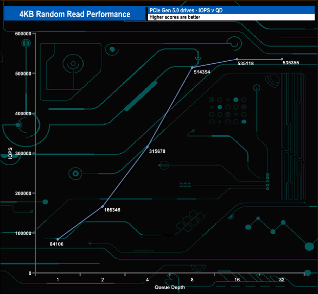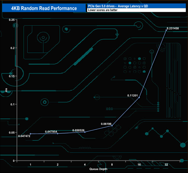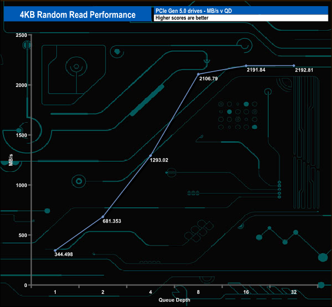 We used CrystalDiskMark 8‘s custom settings to test the 4K random read performance of the drive through a range of queue depths. The setup for the tests is listed below.
