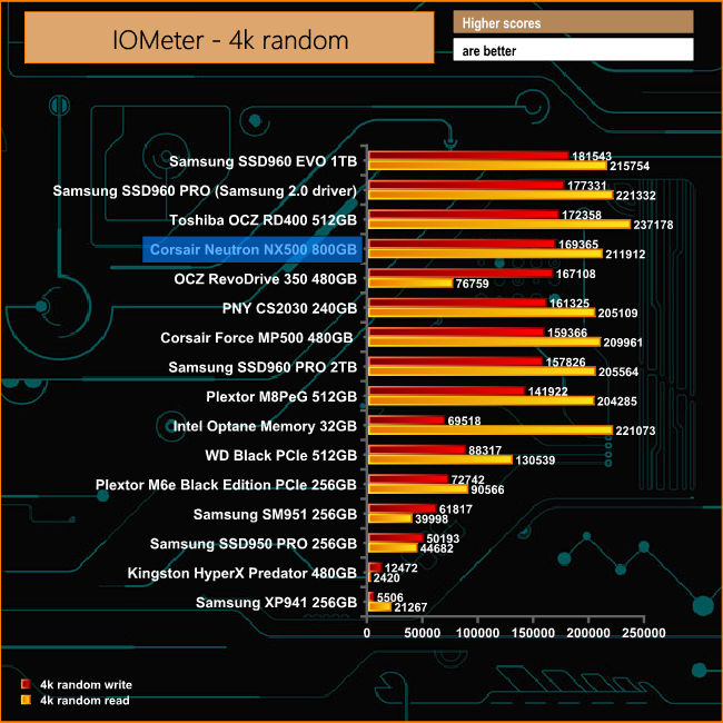 Random 4K read/write performance of the NX500 800GB drive is quoted as up to 300,000 IOPS and 270,000 IOPS, respectively. With our test setup of IOMeter, we couldn't match those official figures.