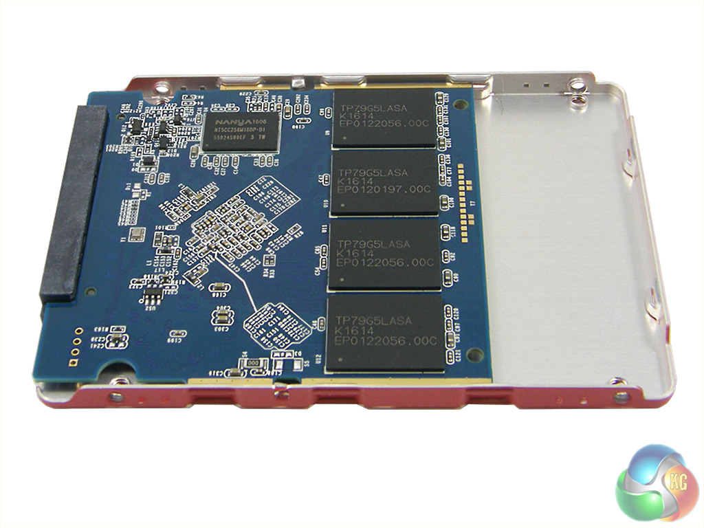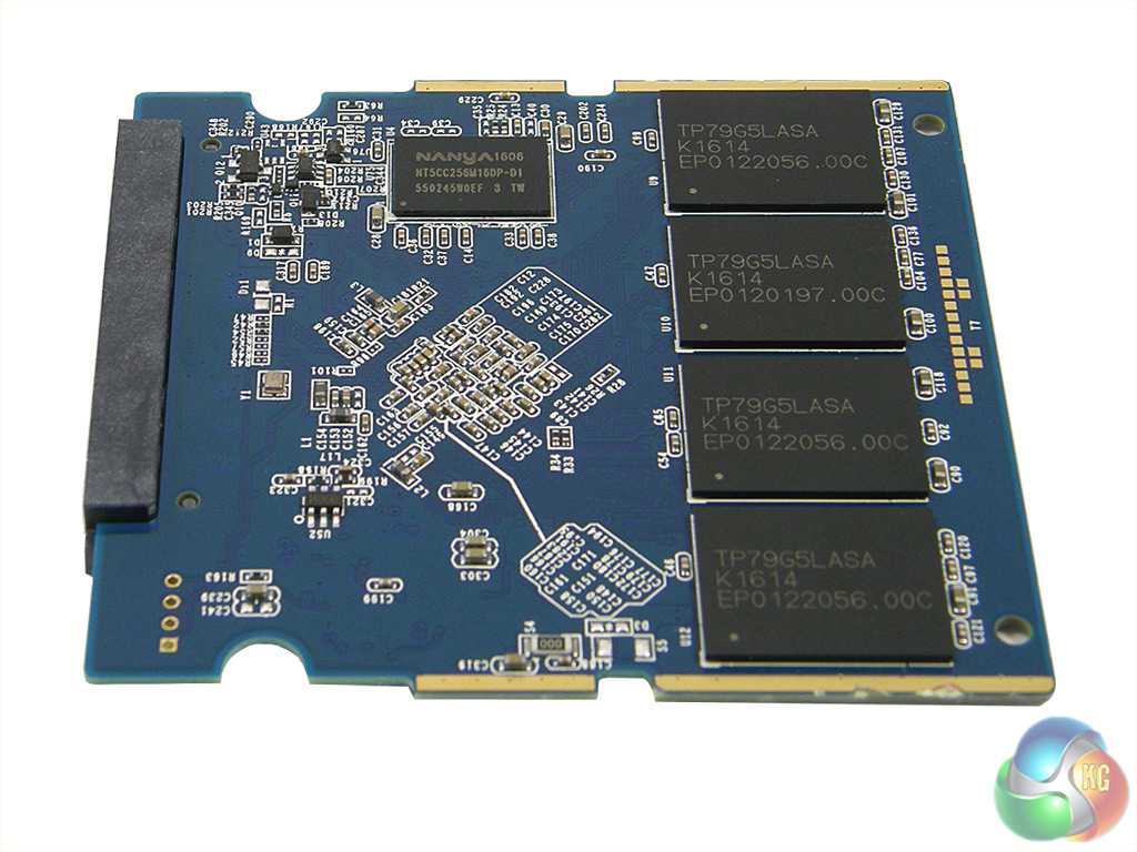 The Neutron XTi 480GB is another drive whose PCB doesn't fill the enclosure. The top side of the board holds four 64GB Toshiba 15mn MLC NAND packages (coded TP79G5LASA) and a single Nanya NT5CC256M16DP-DI 512MB DDR3-1600 cache IC.