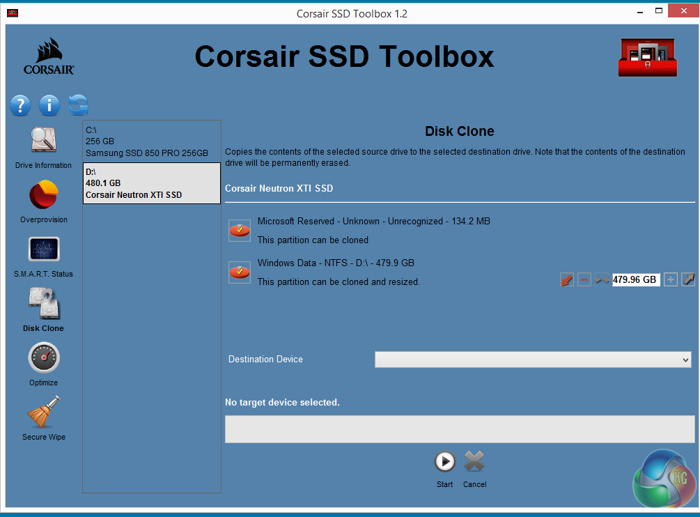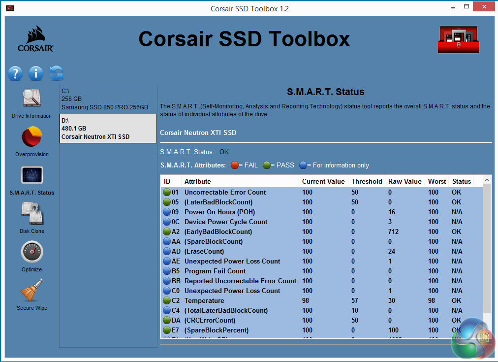 Corsair's SSD management software goes by the name of SSD Toolbox (at the time of writing it's version 1.2.4.2) and is available as a download from Corsair's website. The open page of the utility provides detailed information about the drive and the ability to check for firmware updates and to implement them.
