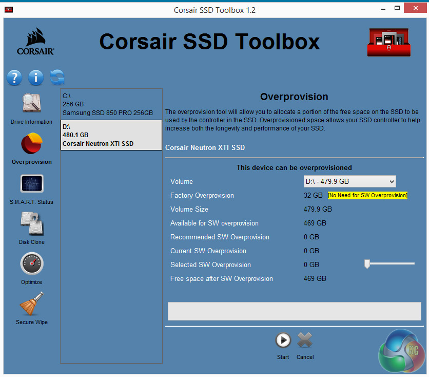 The next section provides the means to manually adjust the Over Provisioning for the drive. A third page provides S.M.A.R.T details and the Toolbox also provides disk cloning, Trim command scheduling and secure erase support.