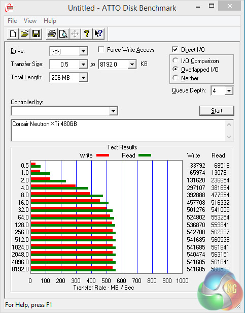 Corsair quote sequential read/write figures for the Neutron XTi 480GB at up to 560MB/s and 540MB/s respectively which are confirmed by the ATTO benchmark, putting the drive firmly into the top 5 fastest 480-512GB 2.5in class drives we've tested to date.