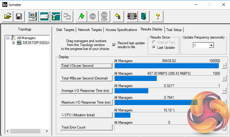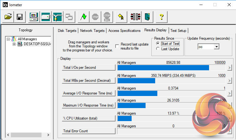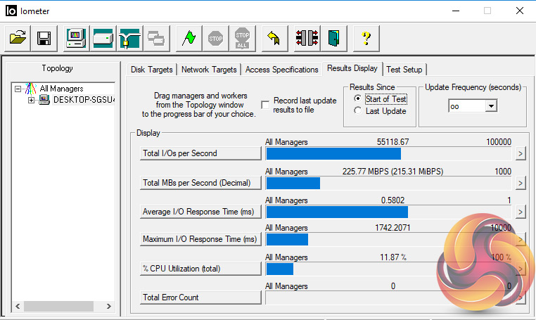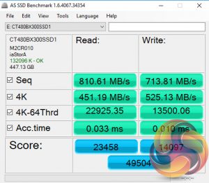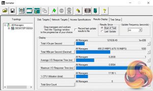In our random 4K tests, the read performance of the drive was improved by switching on the cache technology but not in such an impressive way as the Sequential performance. In standard guise, the drive the produced a score of 99,438 IOPS which went up to 121,638 IOPS under Momentum Cache. But the write performance actually dropped quite dramatically from 85,628 IOPS to 55,118 IOPS.