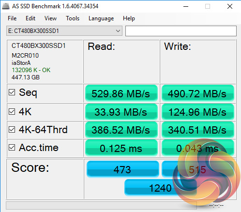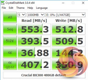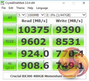 The Sequential read/write performance of the drive when the Momentum technology is applied is stunning with reads jumping from 564MB/s to 2053MB/s and writes rocketing from 526MB/s to 2094MB/s. However, as the ATTO results show, there is high degree of fluctuation in the drive’s performance in the test with the technology enabled.