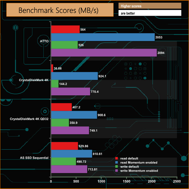 As you can see, turning on the Momentum Cache has a stunning effect on benchmark scores but not only writes, reads get a massive boost too, especially 4K reads.