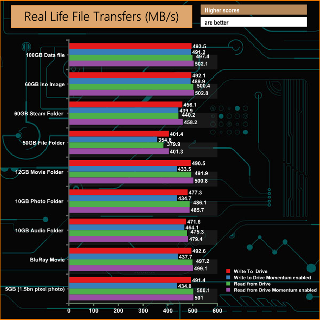 The other real life situation where the technology seemed to make a difference was in the real life file transfer test where the speed of the transfers from the drive got a tiny boost.