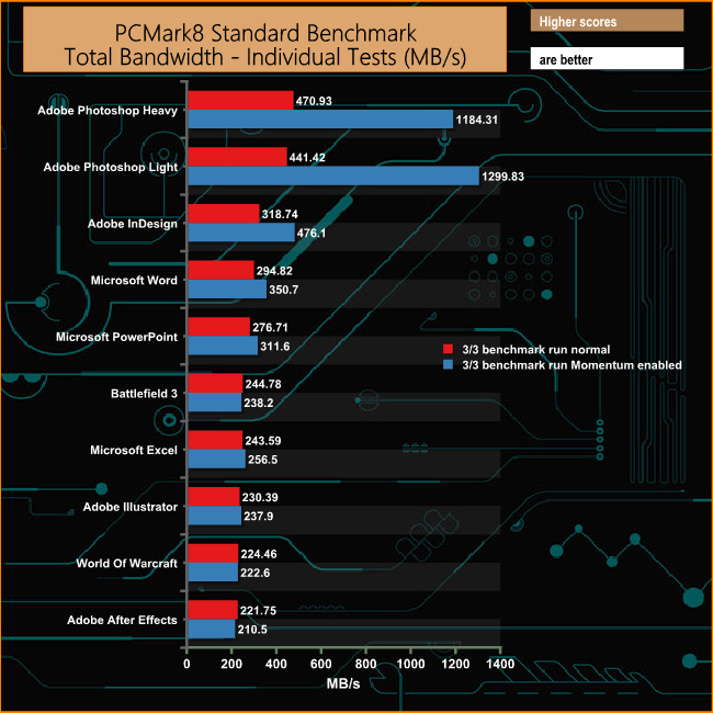 The only two tests in PCMark 8 that get a real boost from the technology are the two Adobe Photoshop ones where the bandwidth rockets from 441.42MB/s to 1,299.83MB/s in the Photoshop Light test and from 470.93MB/s up to 1,184.31MB/s for the Photoshop Heavy trace.