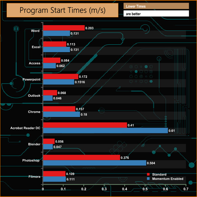 We used a variety of different applications and measured their load times to see if the Momentum Cache made any difference. The short answer is no. In fact, most were slower loading with the technology enabled, with the exception of Blender and the Microsoft Office applications apart from Excel. But as we’re talking milliseconds, you won’t notice the difference.