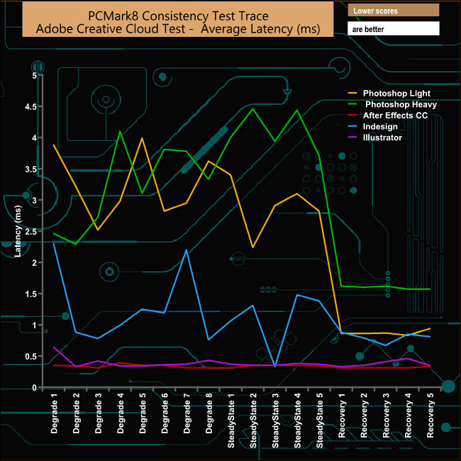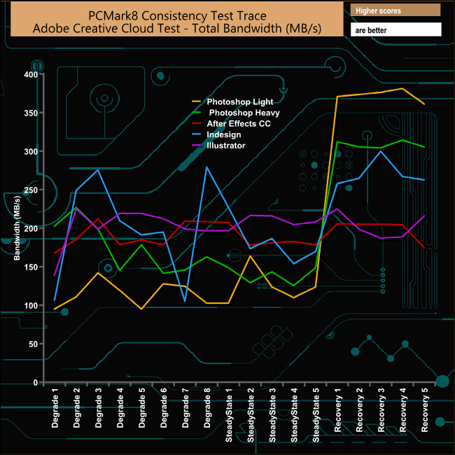 The drive's performance during the Adobe CC test phases is erratic to say the least. It suffers during the Photoshop Heavy tests dropping as low as 125.3MB/s at one point. But the drive bounces back during the Recovery phase with an average of 308.29 MB/s for the five runs.
