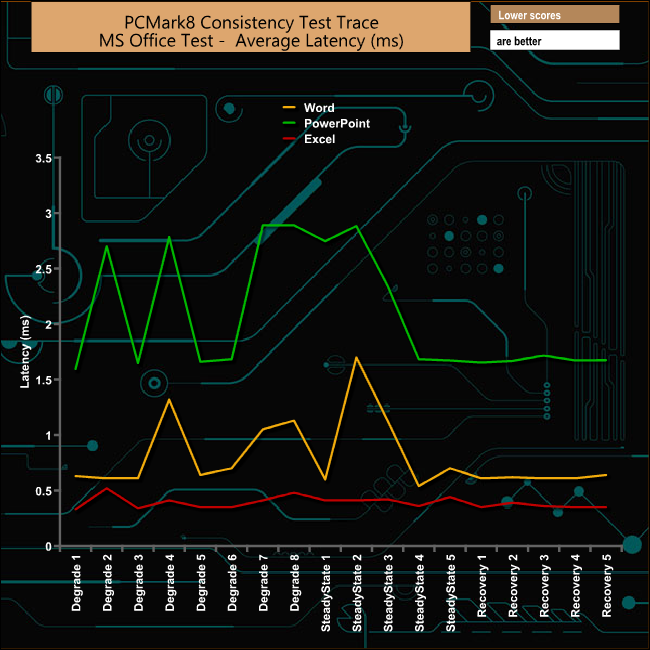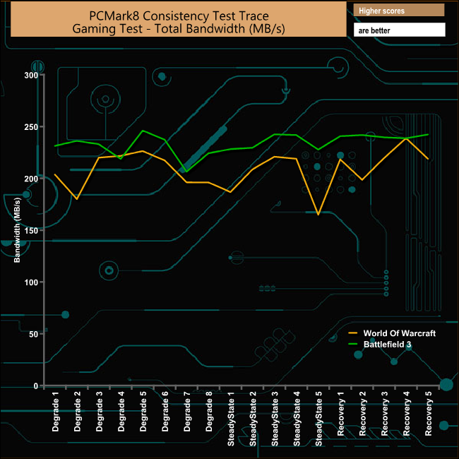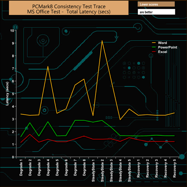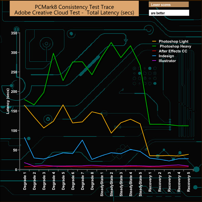 PCMark 8’s Consistency test provides a huge amount of performance data, so here we’ve looked a little closer at how the Crucial BX300 performs in each of the benchmarks test suites.