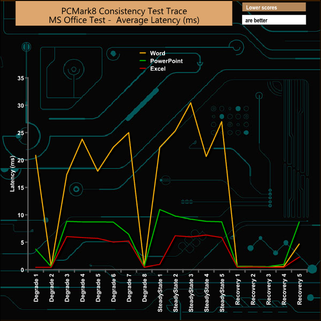 PCMark 8’s Consistency test provides a huge amount of performance data, so here we’ve looked a little closer at how the BX500 performs in each of the benchmarks test suites.