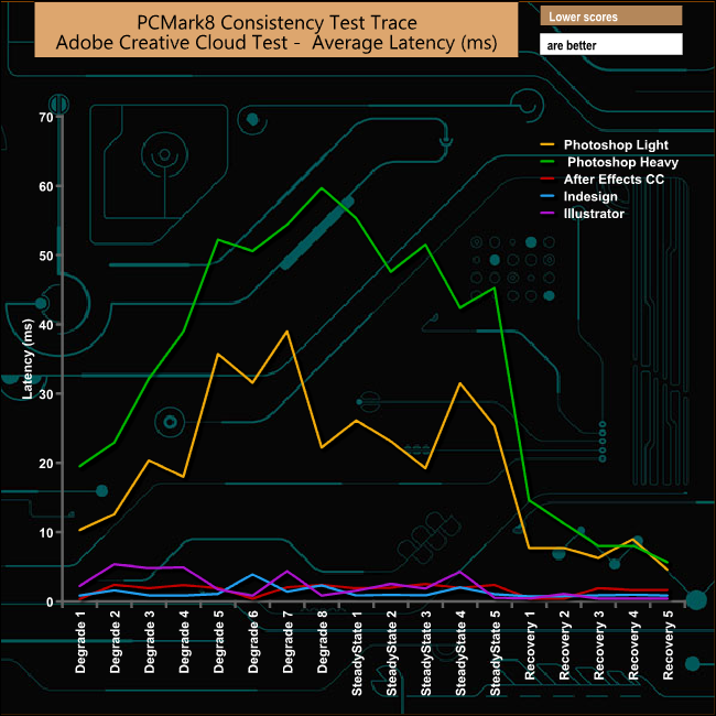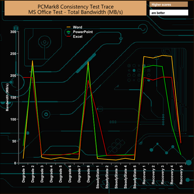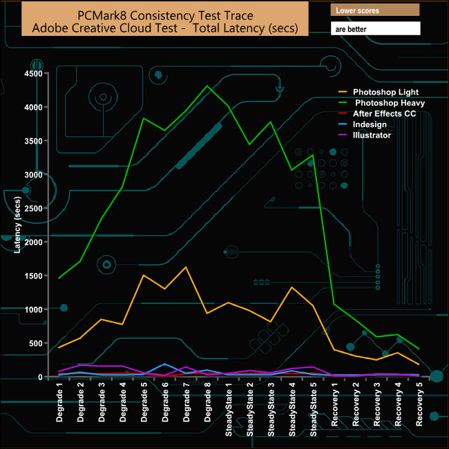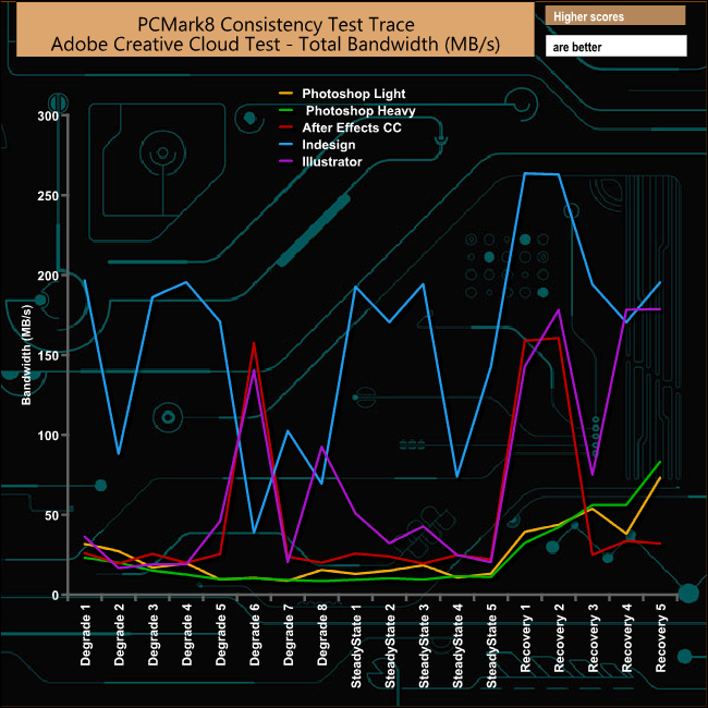 The drive takes a pounding during the Photoshop Heavy and Light tests and the recovery phases for both test traces are somewhat erratic. The drive handles the Adobe InDesign trace the best of all but even here there are some dramatic plunges in bandwidth during the Degradation and Steady State phases.