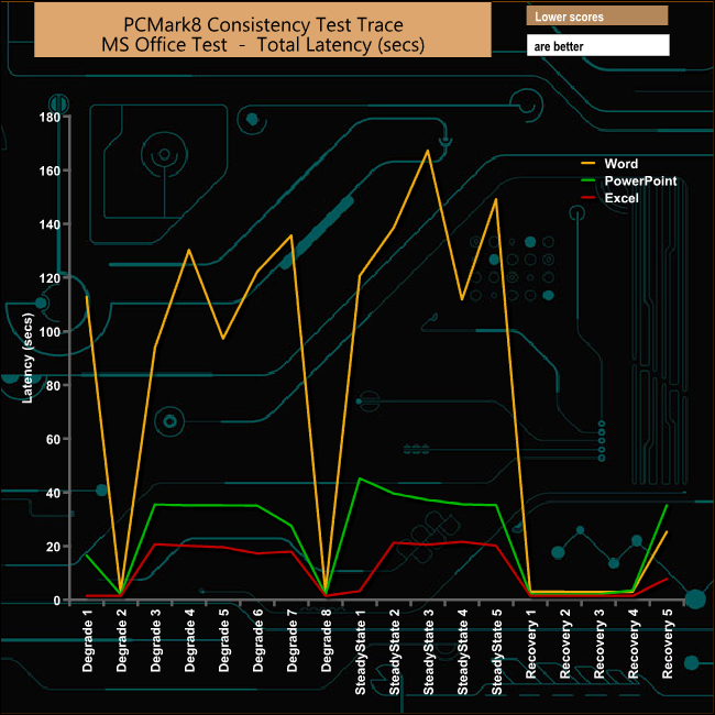 The BX500 really struggles with the Word trace in the MS Office tests and the recovery phases for all of the three Office tests sees bandwidths falling off a cliff by the end of the test.