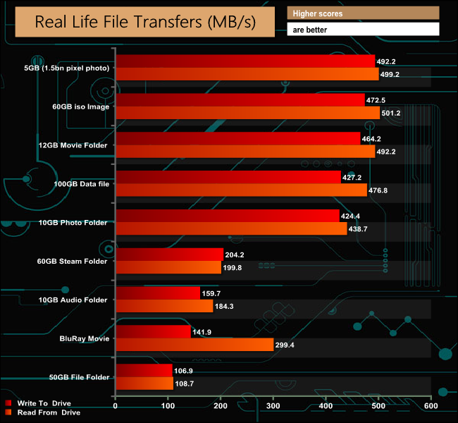 The BX500 had no problems with our real life file transfer tests getting well over 400MB/s for all the larger file size tests but it didn't handle the smaller bity files of the 50GB file folder anywhere near as well.