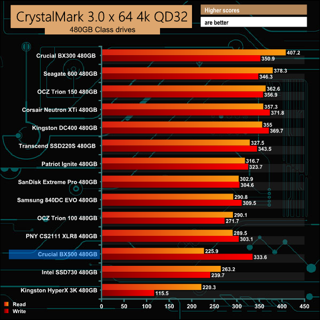 Crucial's BX500 is not the fastest when it comes to handling small bity files at a deepish queue depths although having said that the write performance is better than the read. Looking at the result screens it seems the Silicon Motion SM2258XT controller doesn't have a preference on what type of data it is handling