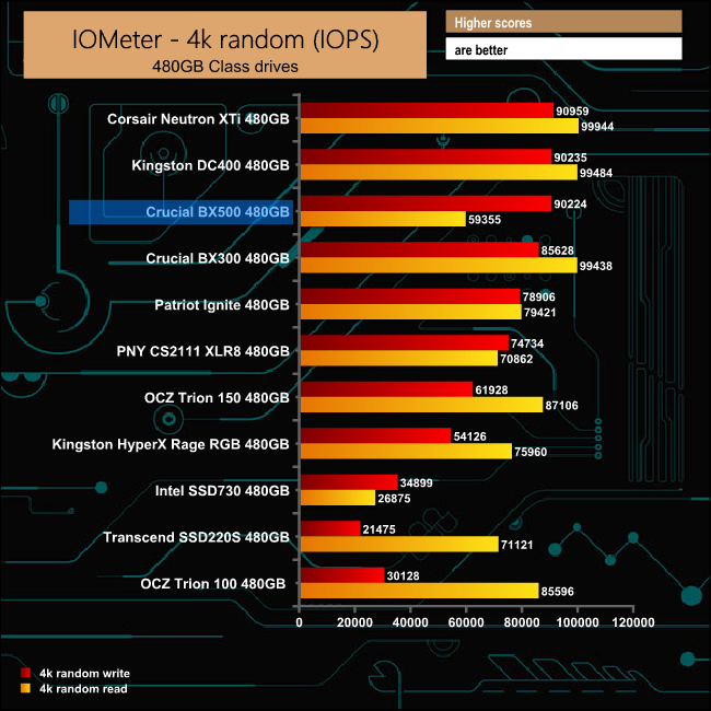 When dealing with random 4K data the BX500 drive get a healthy boost in write performance from the dynamic SLC buffer that Crucial have used to improve performance.
