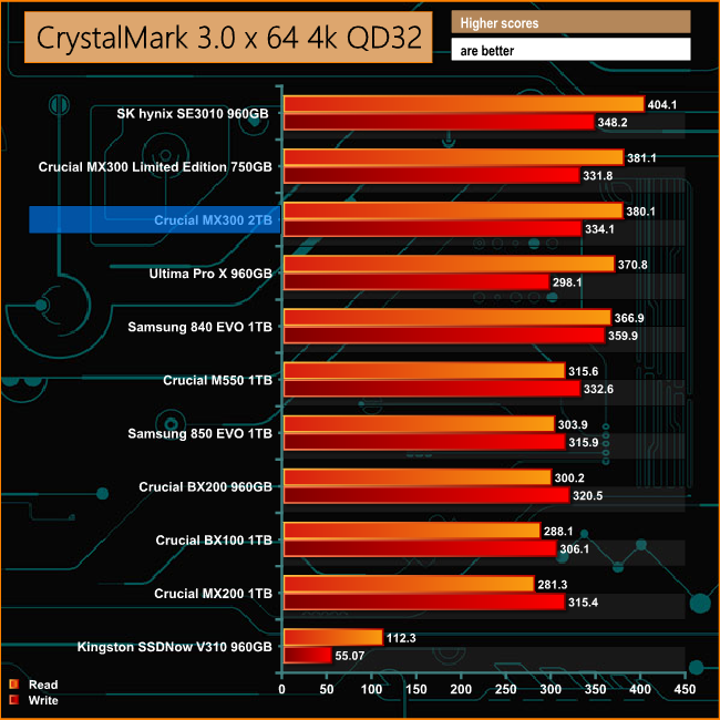 The 2TB MX300 4K write performance at deeper queue depths is pretty good, scoring over 300MB/s while at shallow depths it is also good. Not so good is its 4K read performance at shallow depths.