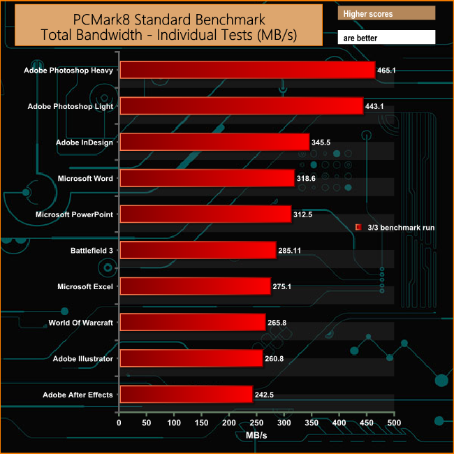 In the third and final run of the standard PCM8 Storage benchmark, the BX300 dealt with the two tough Adobe Photoshop tests rather well, especially the demanding Photoshop Heavy test, producing a bandwidth score of 465.1MB/s.