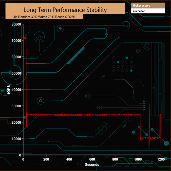 For the long term performance stability test, we set the drive up to run a 20-minute 4K random test with a 30% write, 70% read split, at a Queue Depth of 256 over the entire disk. The 500GB MX500 averaged 23,684 IOPS for the test with a performance stability of 33.1%.