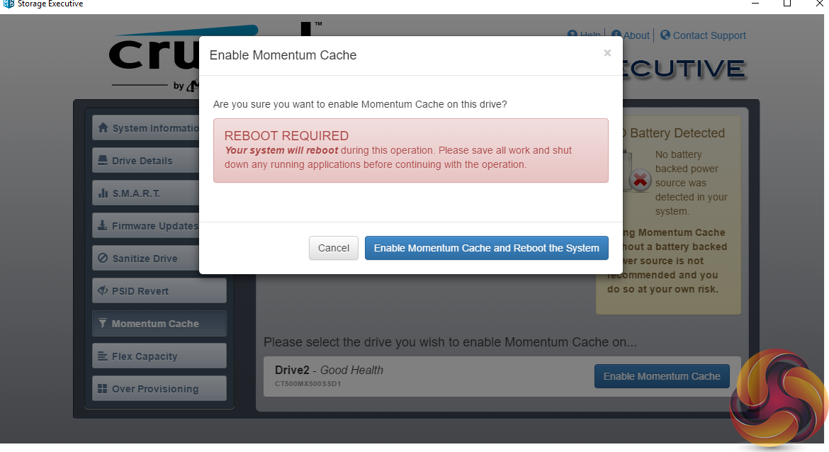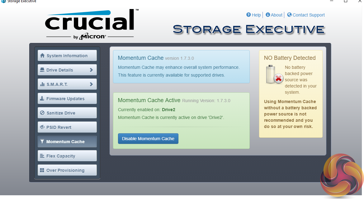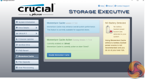 Crucial’s Momentum Cache technology is an intelligent software driver that dynamically leverages unused system memory to enhance burst performance and to overcome the fact that SSDs typically have better read performance that write. Momentum Cache will use up to 25% of available system memory, though no more than 4GB.