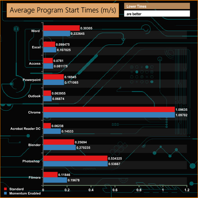 We used a variety of different applications and measured their load times to see if the Momentum Cache made any difference. The short answer is no. In fact, most were slower loading with the technology enabled, with the exception of Microsoft Word. But as we’re talking milliseconds, you won’t notice the difference.