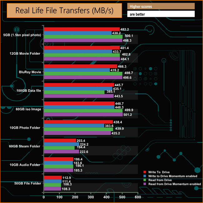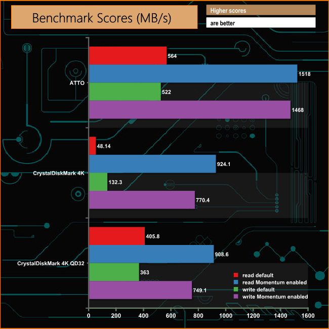 As you can see, turning on the Momentum Cache has a stunning effect on benchmark scores but not only writes, reads get a massive boost too, especially 4K reads. The Sequential read/write performance of the drive when the Momentum technology is applied is stunning with reads jumping from 564MB/s to 1,518MB/s and writes rocketing from 522MB/s to 1,468MB/s.